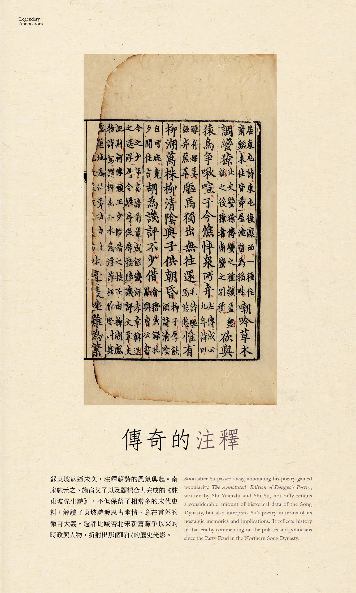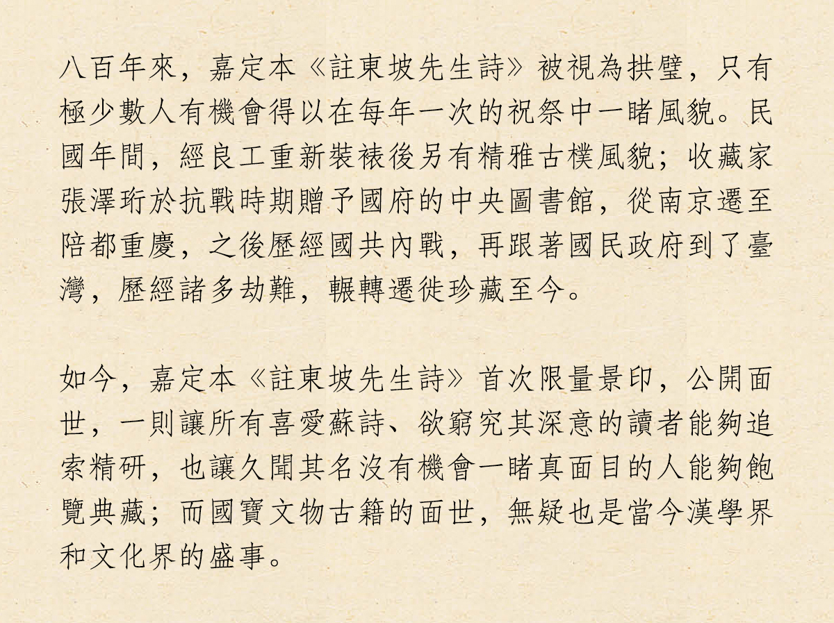 蘇東坡病逝不久,注釋蘇詩的風氣興起。南宋施元之、施宿父子以及顧禧合力完成的《註東坡先生詩》,不但保留了相當多的宋代史料,解讀了東坡詩發思古幽情、意在言外的微言大義,還評比臧否北宋新舊黨爭以來的時政與人物,折射出那個時代的歷史光影。