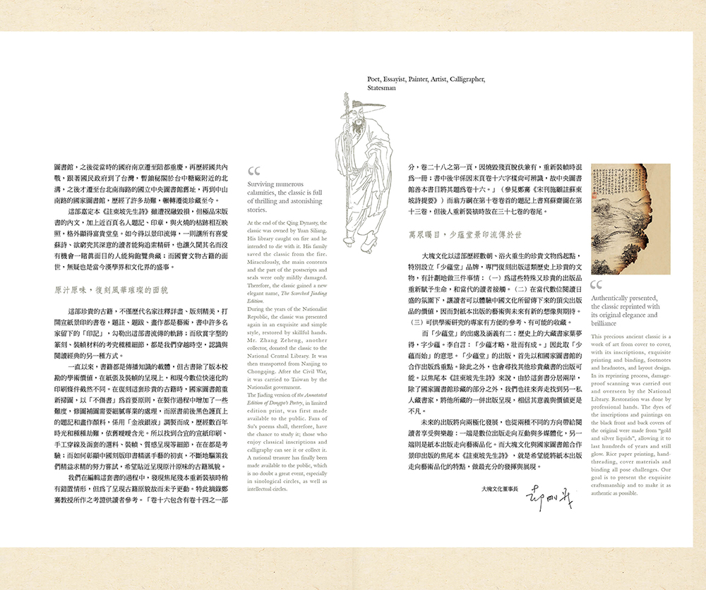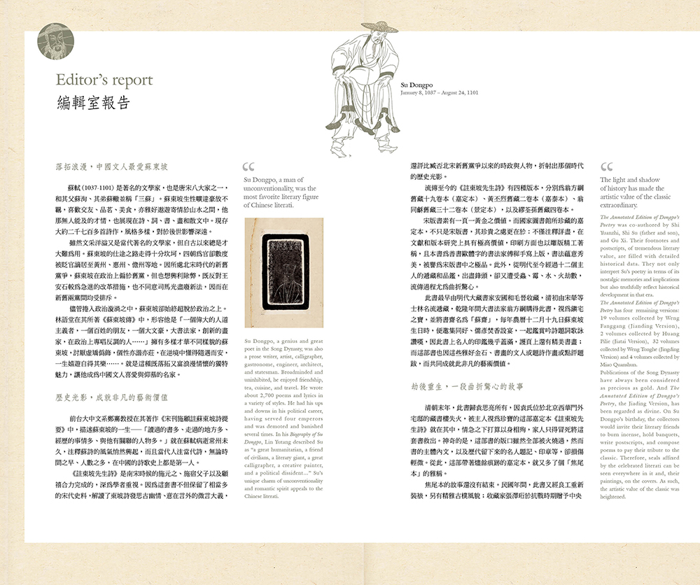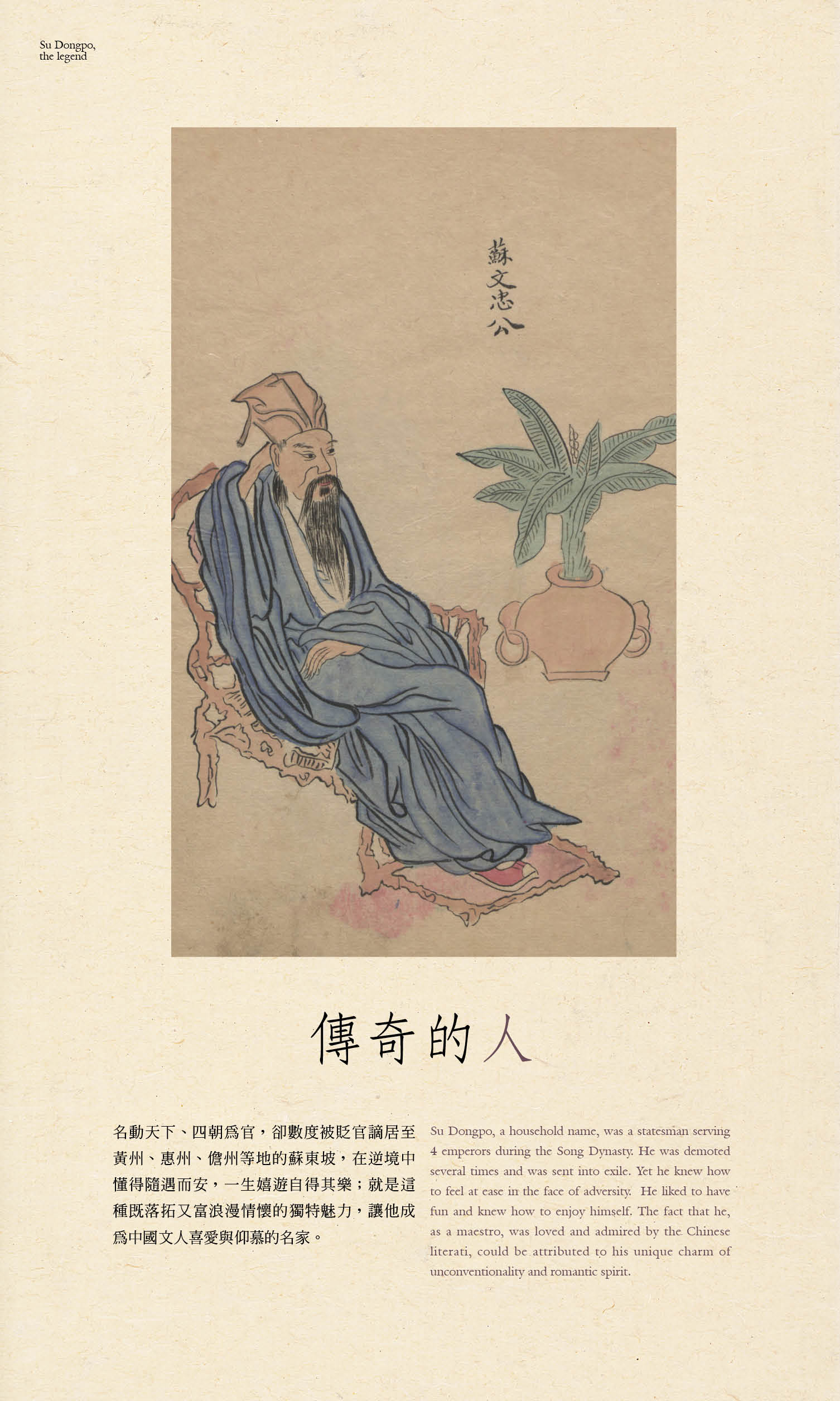 蘇東坡才華洋溢、曠達不羈,喜歡交友、品茗、美食,亦雅好遨遊寄情於山水之間。從初試啼聲、名動天下、四朝為官,又因新舊黨爭、遭人誣陷,數度被貶官謫居至黃州、惠州、儋州等地,蘇東坡在逆境中懂得隨遇而安,一生嬉遊自得其樂;就是這種既落拓又富浪漫情懷的獨特魅力,讓他成為中國文人喜愛與仰慕的名家。