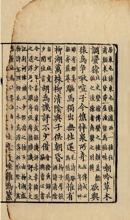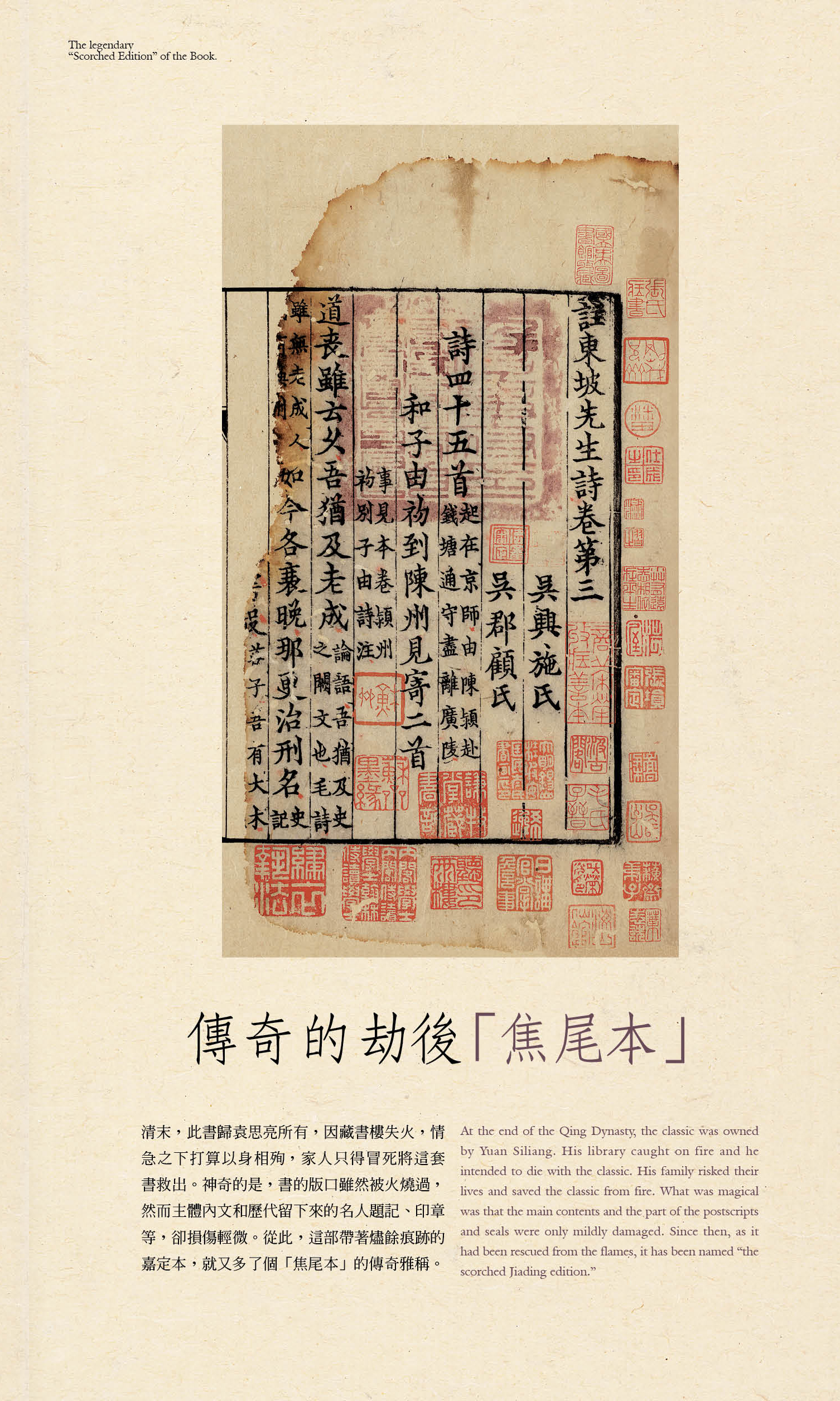 清末,此書歸袁思亮所有,因其藏書樓失火,情急之下打算以身相殉,家人只得冒死將這套書救出。神奇的是,書的版口雖被火燒過,然而主體內文和歴代留下來的名人題記、印章等,卻損傷輕微。從此,這部帶著燼餘痕跡的嘉定本,就又多了個「焦尾本」的傳奇雅稱。