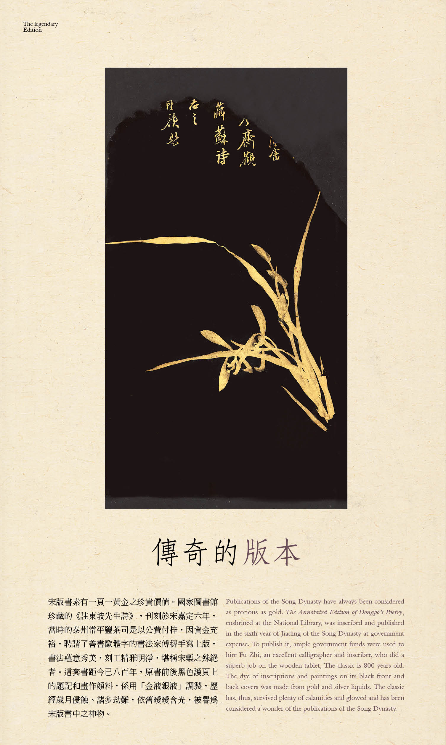 宋版書素有一頁一黃金之珍貴價值。國家圖書館珍藏的《註東坡先生詩》,刊刻於宋嘉定六年,當時的泰州常平鹽茶司是以公費付梓,因資金充裕聘請了善書歐體字的書法家傅穉手寫上版,書法蘊意秀美,刻工精雅明淨,堪稱宋槧之殊絕者。這套書距今已八百年,原書前後黑色護頁上的題記和畫作顏料,係用「金液銀液」調製,歷經歲月侵蝕、諸多劫難,依舊曖曖含光,被譽為宋版書中之神物。