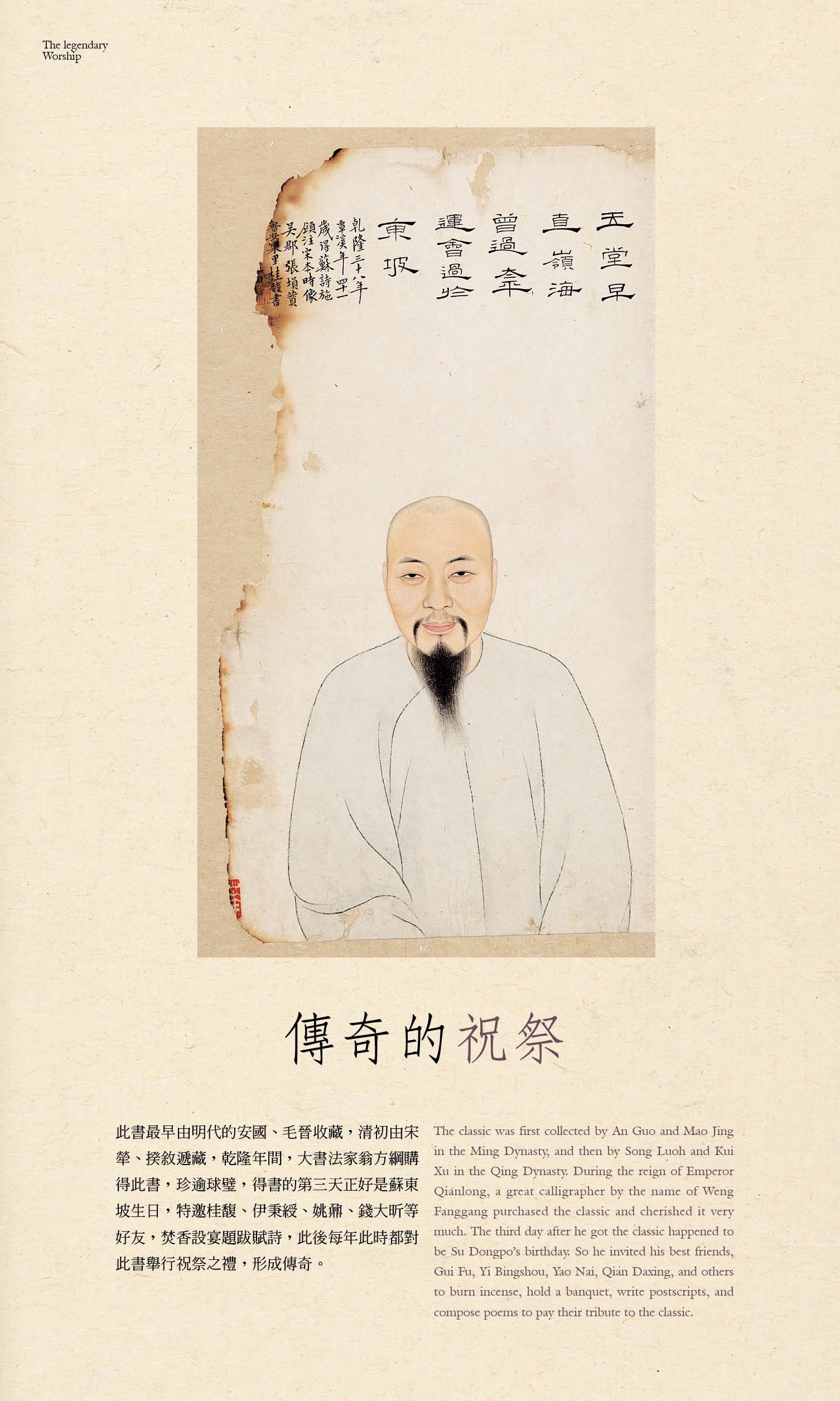 此書最早由明代的安國、毛晉收藏,清初由宋犖、揆敘遞藏,乾隆年間大書法家翁方綱購得此書,視為鎮宅之寶,得書的第三天正好是蘇東坡生日,特邀來桂馥、伊秉綬、姚鼐、錢大昕等好友,焚香設宴題跋賦詩,此後每年此時都對此書舉行祝祭之禮,形成傳奇。