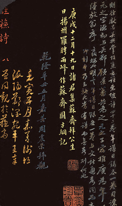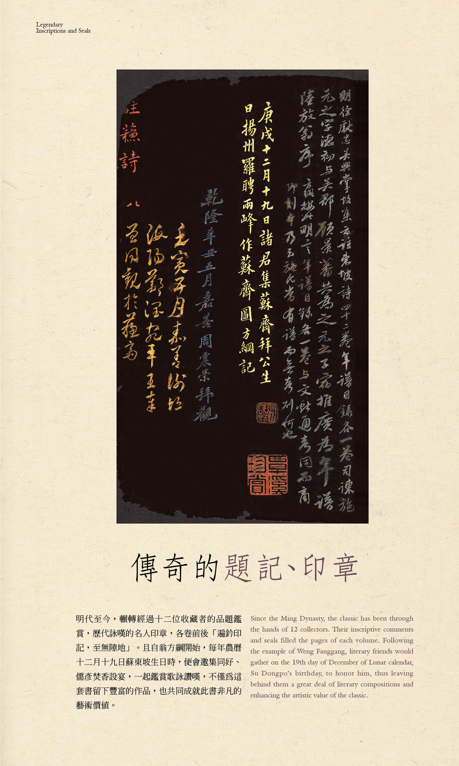 明代至今,輾轉經過十二位收藏者的品題鑑賞,歴代詠嘆的名人印章,各卷前後「遍鈐印記,至無隙地」。且自翁方綱開始,每年農曆十二月十九日蘇東坡生日,便邀集同好、儒彥焚香設宴,一起鑑賞歌詠讚嘆,不僅為這套書留下豐富的作品,也共同成就此書非凡的藝術價值。