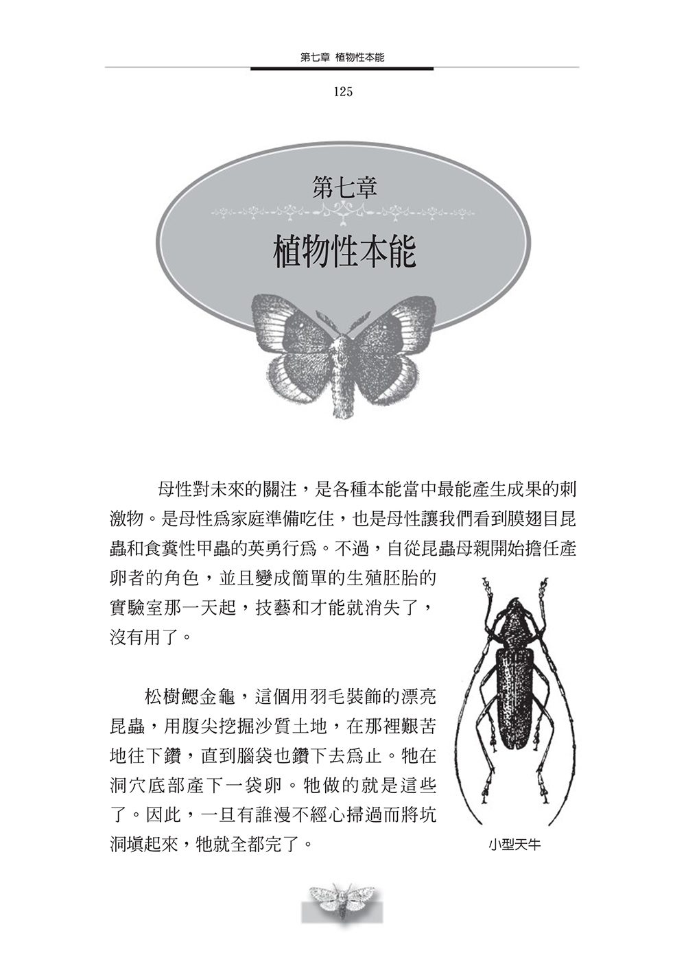 彼此隔絕,如今已成了令人嫌惡的東西。然而,如果說我是為了那些企圖有朝一日稍微弄清楚「本能」這個熱門問題的學者、哲學家們而寫,其實我更是為年輕人而寫,我希望使他們熱愛這門被你們弄得令人憎惡的博物學。這就是為什麼我在極力保持翔實的同時,不採用你們那種科學性的文字,因為這種文字似乎是從休倫人的語言中借用來的。這種情況,唉!真是太常見了。