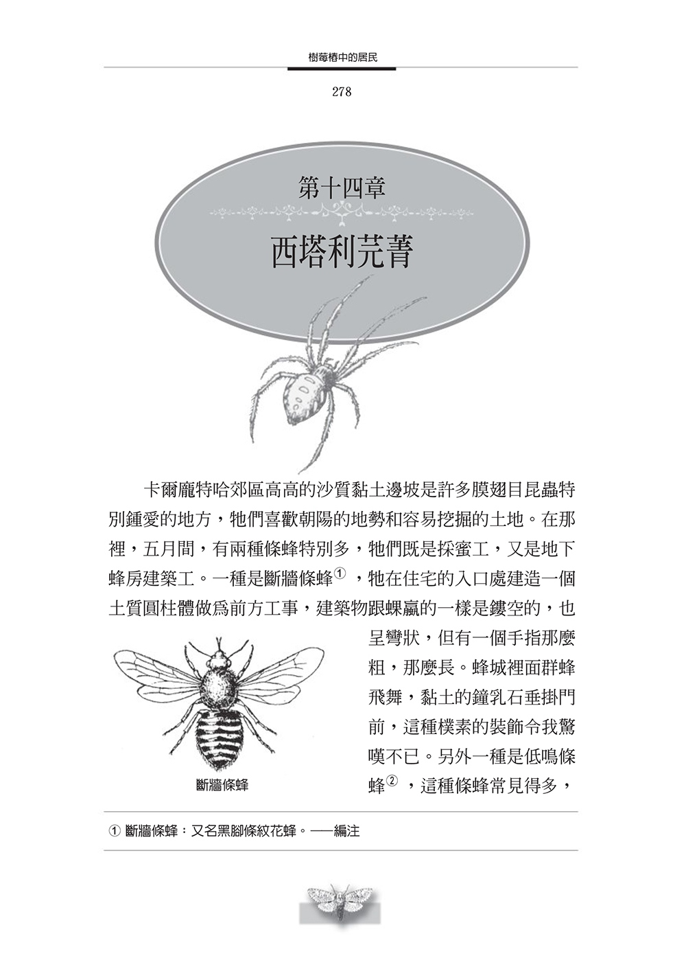 四周一片廢墟,中間一堵斷牆聳立,石灰和沙使它巍然不動,這屹立著的斷牆就是我對科學真理的熱愛。哦!我靈巧的膜翅目昆蟲啊!這種熱愛是不是足以讓我名正言順地對你們的故事再添上幾頁呢?我會不會力不從心呢?為什麼我自己也把你們拋棄了這麼長的時間呢?一些朋友為此責備我。啊!告訴他們,告訴那些既是你們的也是我的朋友們。告訴他們:並不是由於我的遺忘、我的懶散、我的拋棄,我想念你們,我深信節腹泥蜂的窩還會告訴我們動人的秘密,飛蝗泥蜂的捕獵還會給我們帶來驚奇的故事。但是我缺少時間,我在跟不幸的命運搏鬥中,孤立無援,被人遺棄,在高談闊論之前,必須能夠活下去。請您告訴他們吧,他們會原諒我的。