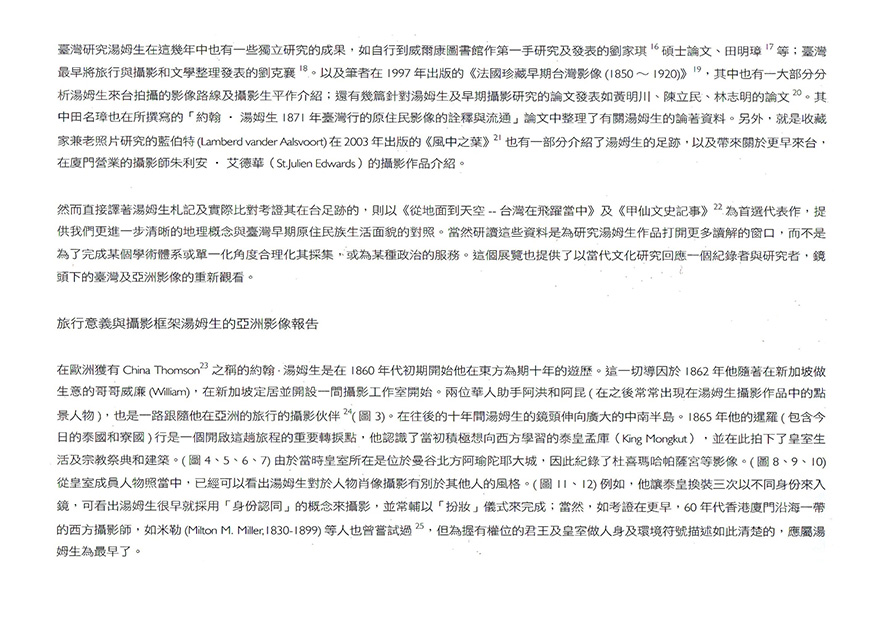 高雄市立美術館於2012年以「約翰‧湯姆生│世紀影像特展」為題展出以約翰‧湯姆生所拍攝的福爾摩沙(台灣)影像為核心,並循著其百年前亞洲行旅的足跡展開,本書收錄展覽共計約250件經典影像,隨著鏡頭走入充滿人文況味的時空之旅。透過玻璃底版看見的微歷史,湯姆生以其獨特的眼光與感情,映現並框架了一個他眼底東方異域在千年孕育下,其深厚歷史文化中的寧靜悠遠…