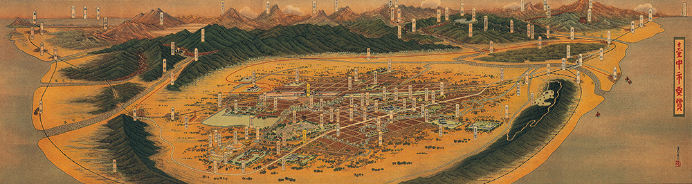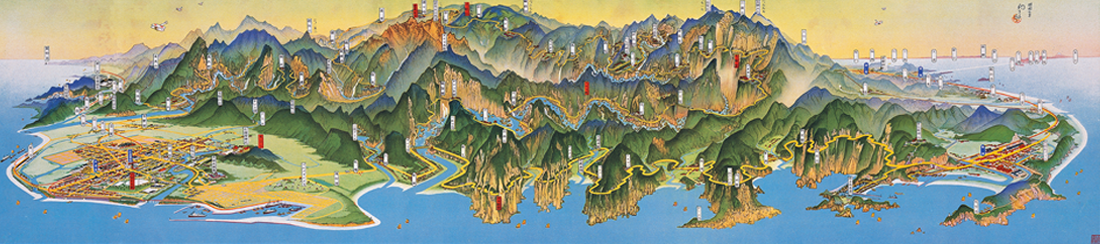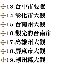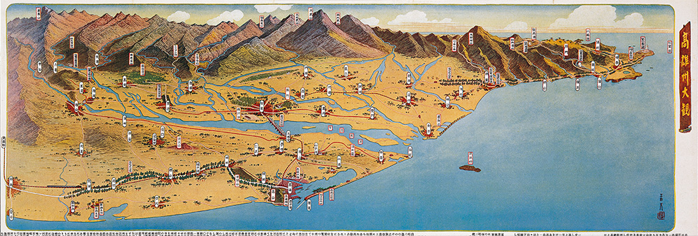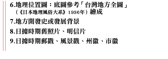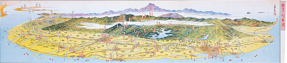 這些早期的地圖,一再被引用、翻印,成了懷古幽情的最佳圖像,然而一九三O年代所出現「台灣鳥瞰地圖」,由於出版當時僅流傳民間,因此散落各地,不僅難見於圖書館的收藏,連行政機關亦不知有這些圖繪。第一次發現這類鳥瞰圖是初中時在牯嶺街的舊書攤,我從地面上挑起了「新竹州鳥瞰圖」、「新高山阿里山案內」,以每張五元購得,當時即下宏願,要將全島各地區的鳥瞰圖蒐集完整。但是,此後卻很少再發現了。畢竟這些「遺珍」,是可遇不可求的。