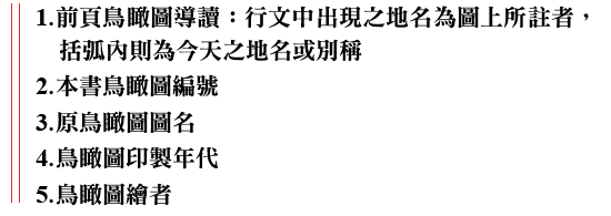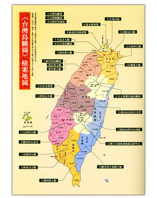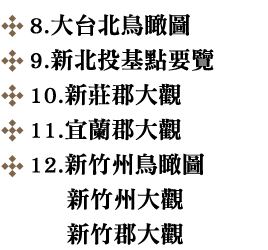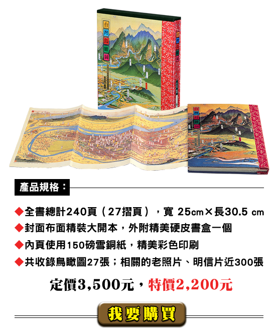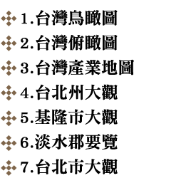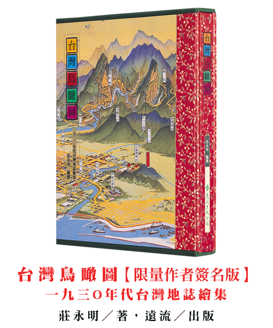 而今,很幸運的從鄭世璠、林漢章、劉峰松、陳慶豐、廖秋娥、李高雄諸人的收藏,及意圖工作室、央圖台灣分館、台北市文獻會等處, 綴足了近三十幅,乃有《台灣鳥瞰圖:一九三O年代台灣地誌繪集》這本書的撰述與出版。