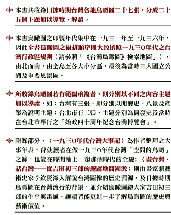 觀覽一九三O年代的台灣鳥瞰圖,不僅是欣賞台灣的好山好水,而且要認知台灣的歷史真情實貌。台灣的山水,有我們的足痕;台灣的歷史,有我們的血汗!