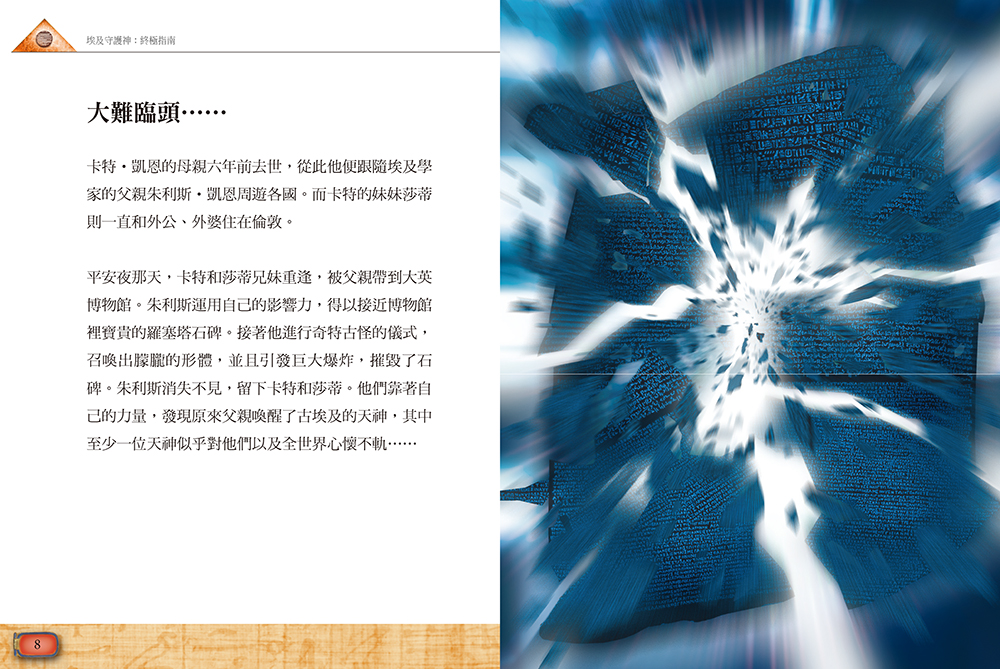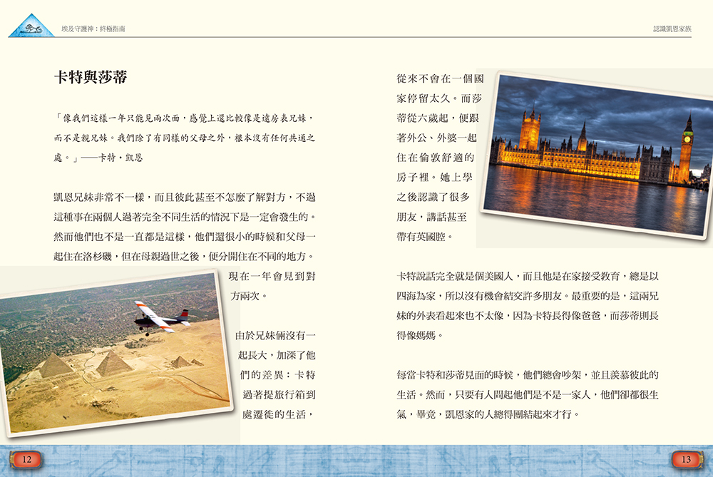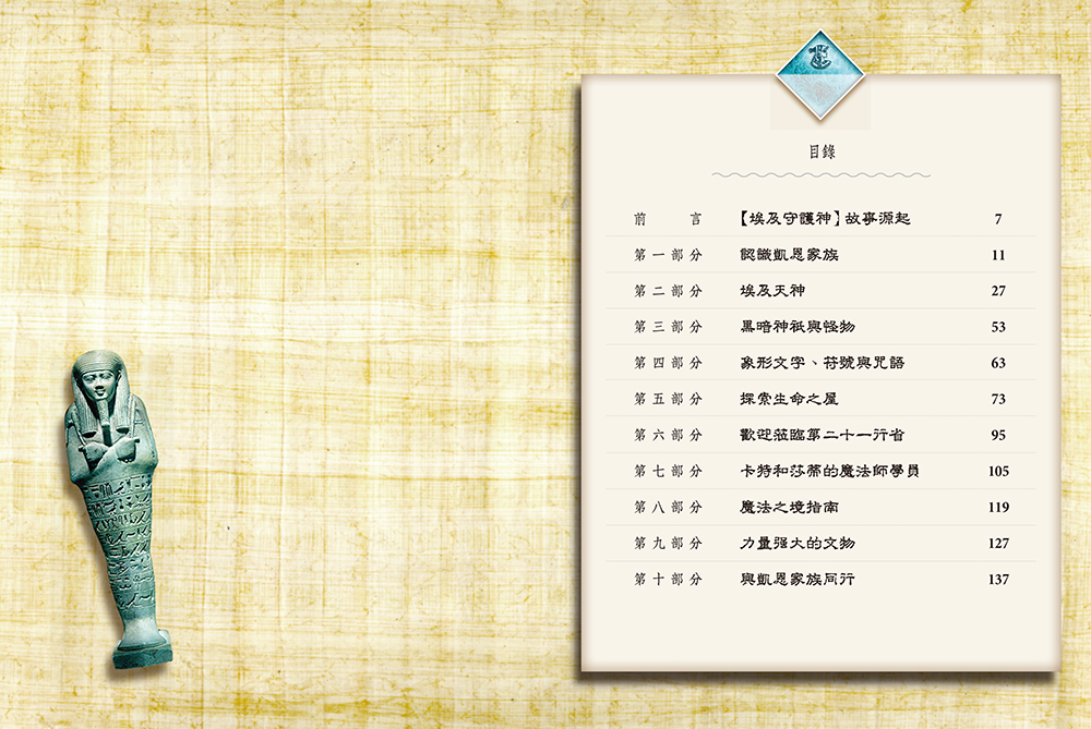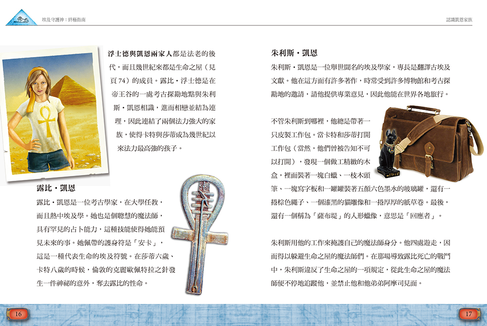 所有在雷克.萊爾頓在《埃及守護神》系列中出現的角色、神祇與魔法地點,全都鮮活而具體地躍然紙上,更藏有魔法師修煉必學咒語。豐富、詳實的文字與精彩奪目的全彩圖片,將帶領你一窺最具神祕色彩的古文明國度──古埃及,你也可以成為呼風喚雨的魔法師和古埃及萬事通!