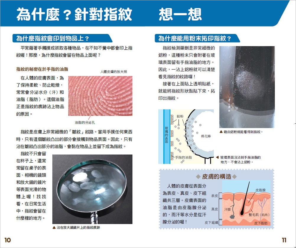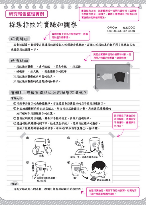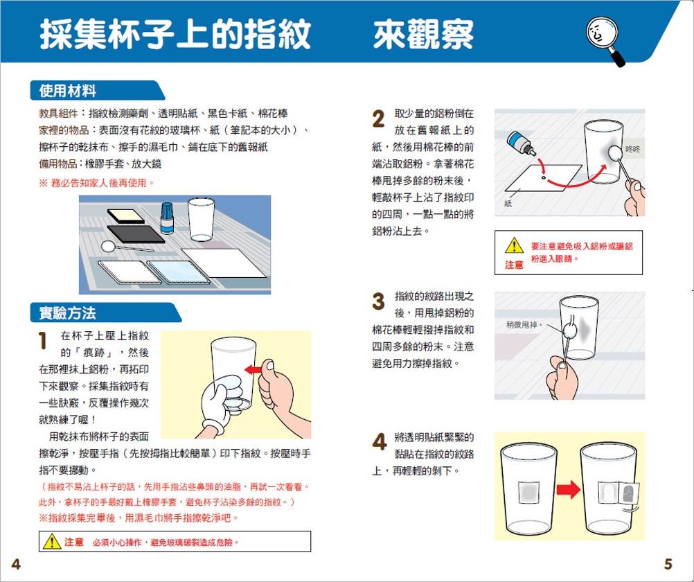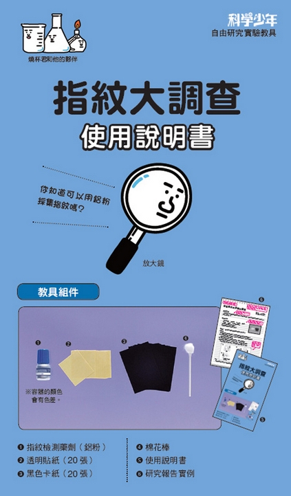透過非常細的鋁粉,來檢測如杯子上的指紋,再以黑紙和透明片保存。這份較具有詳細的說明書解說指紋的類型和形狀,以及如何進行採取指紋的研究。你可研究自己和別人的指紋,觀察看看指紋到底有哪幾種?或者即使是同一個人,每一根指頭的也不一樣;還有家人的指紋是否相似……