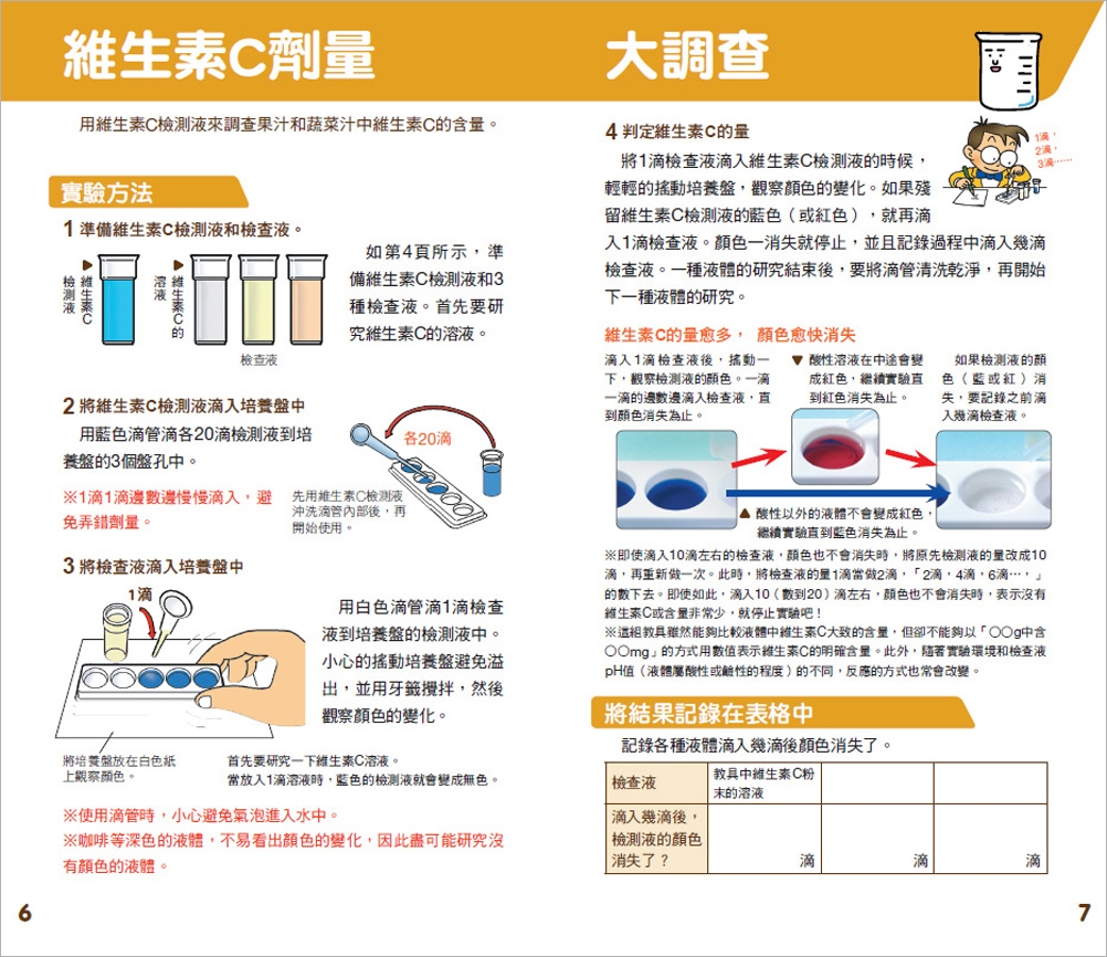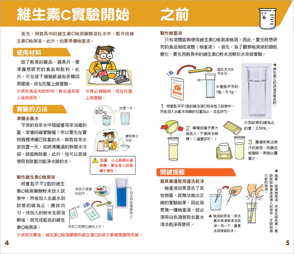 檸檬等水果含有的維生素C,是人類生存不可缺少的重要營養素之一。這項實驗使用的維生素C檢測藥劑,可以比較維生素C在食品中的含量。此項實驗可以得知什麼樣的水果和蔬菜含有大量的維生素C,而且也可以試試果汁和茶等飲料。此外,利用維生素C的性質也能夠變出好玩的魔術!