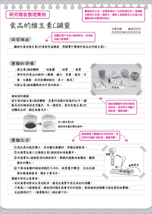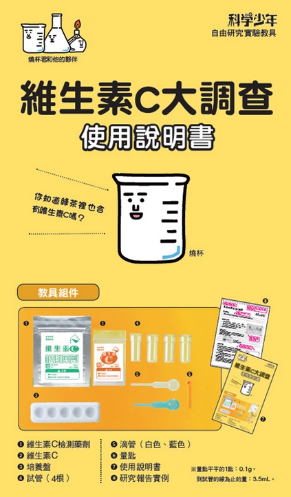 《自由研究:維生素C大調查》由日本學研研發設計,是一組專為喜歡自己動手做科學實驗的青少年所設計的實驗材料包。透過精確的實驗材料與步驟的設計,不只讓實驗簡單、好操作,仍能達到極佳的實驗成果。透過維生素C實驗材料包所附的檢驗藥劑與工具,就可以來檢測你想知道有沒有含維生素C,或是維生素C含量多不多的各種食品。