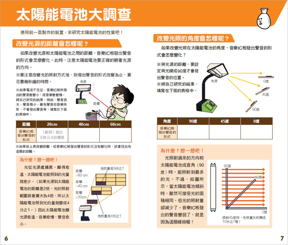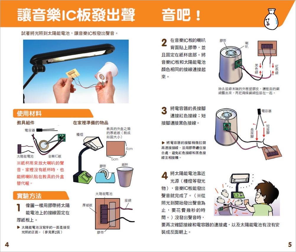 太陽能電池常被應用在電子計算機、手錶上,是能將光能改變成電能的零件。在這個教具中,使用少量電力也會發出聲音的音樂IC板,來研究太陽能電池的作用。透過實驗,可以觀察太陽或燈光,哪個產生的電比較強?照射角度會不會影響?