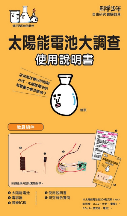 《自由研究:太陽能電池大調查》由日本學研研發設計,是一組專為喜歡自己動手做科學實驗的青少年所設計的實驗材料包。透過精確的實驗材料與步驟的設計,不只讓實驗簡單、好操作,仍能達到極佳的實驗成果。透過太陽能電池實驗材料包所附的太陽能電池、音樂IC板等,就可以自行組裝一個太陽能檢測器,測試各種太陽能電池的性質,還能做出有趣的太陽能裝置。