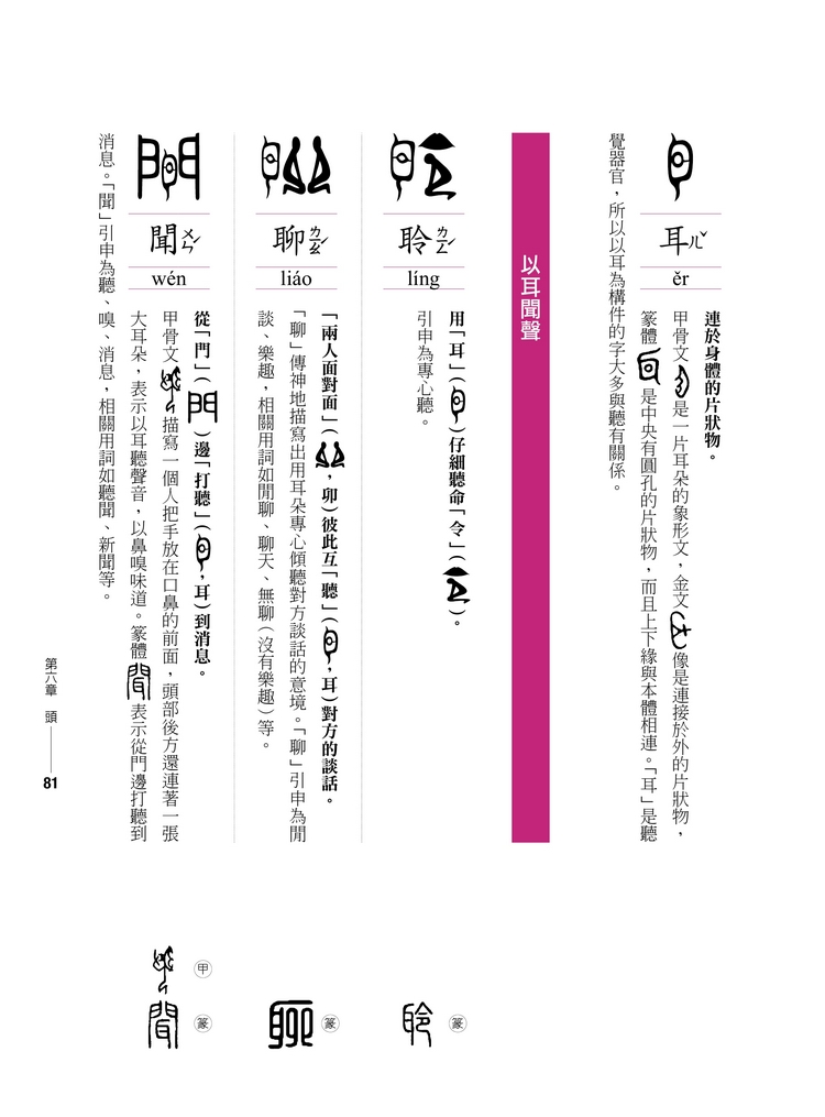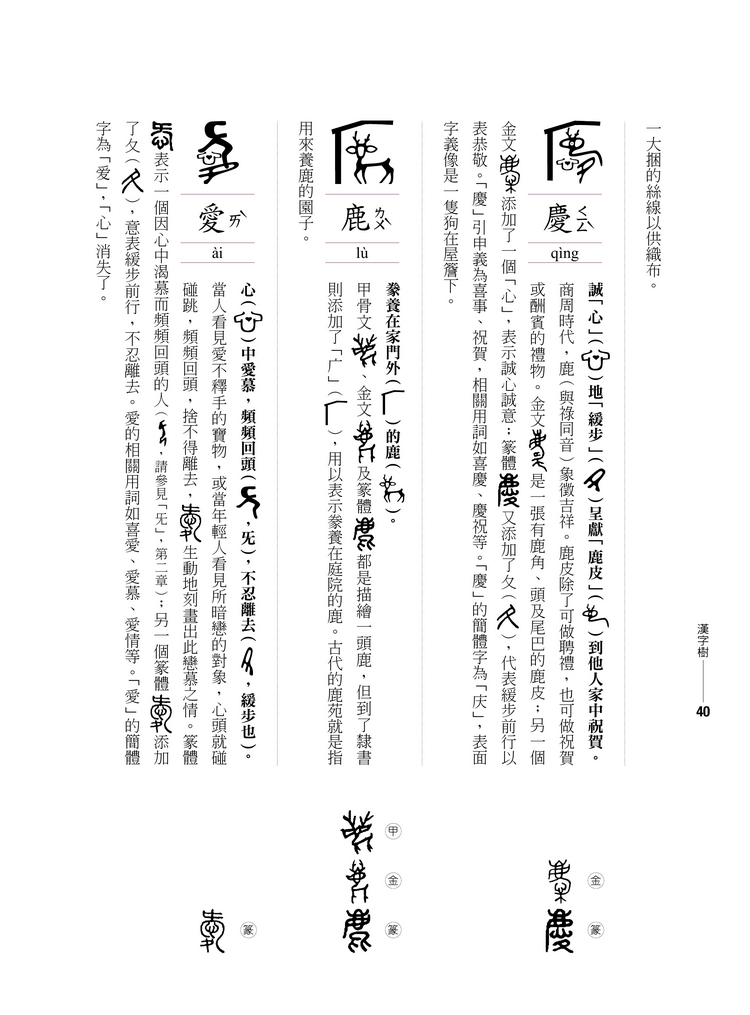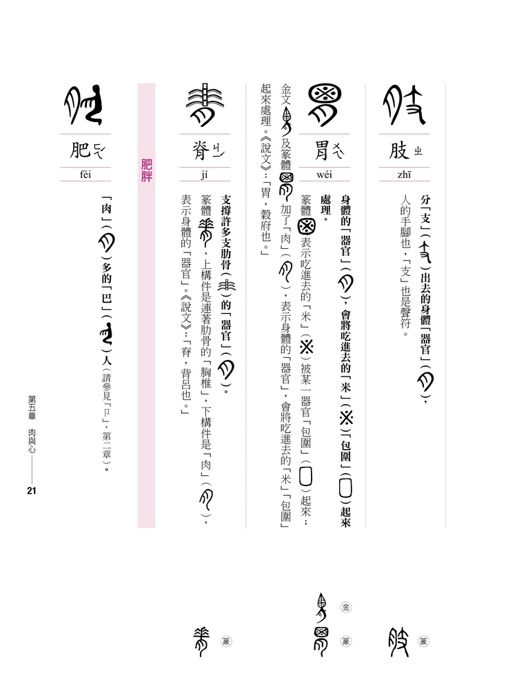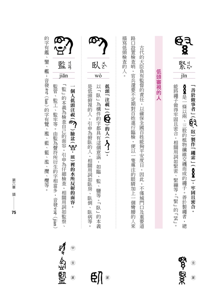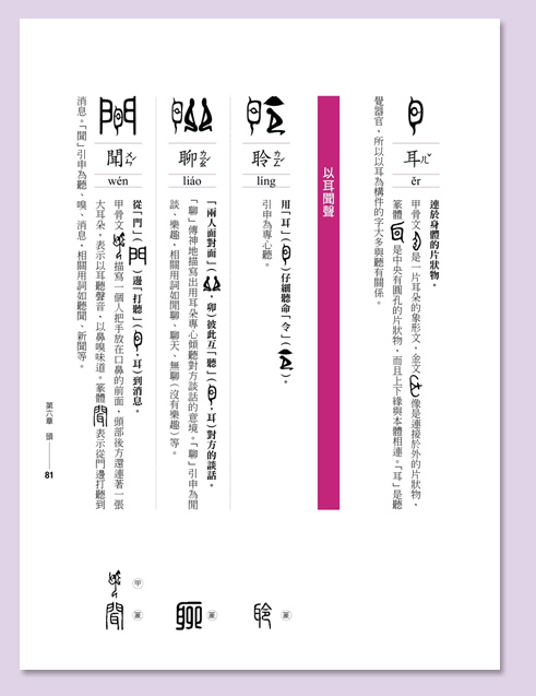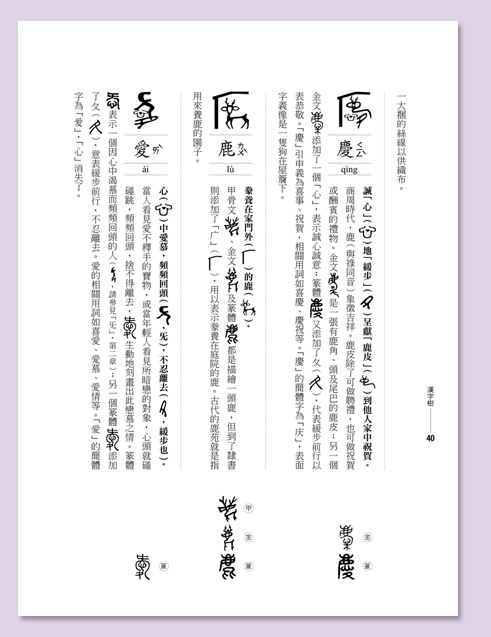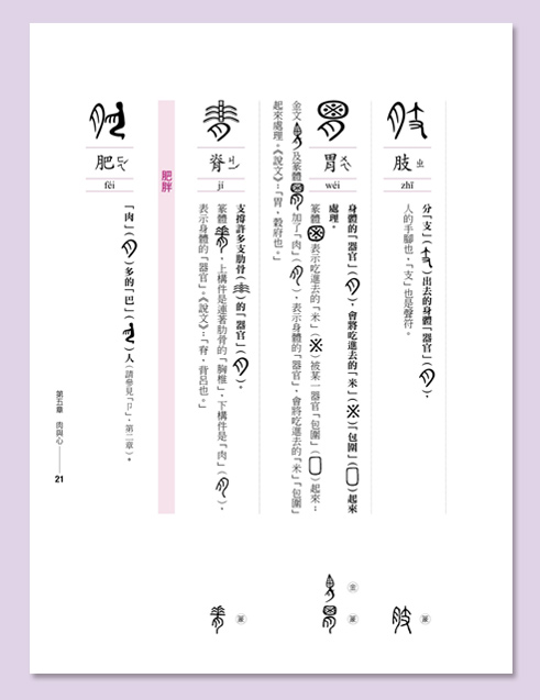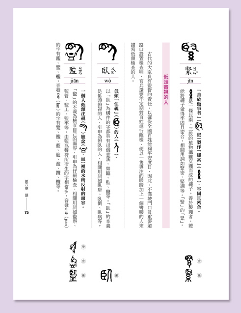 而且古體字當中,有許多有不同的造字來源,非常一致性,也難以系統化,以致於產生學習的障礙。為了使漢字更有系統化,本書主要是選取最能與現代漢字相呼應的甲骨文、金文或篆體。我認為唯有如此才有助於有系統地學習現代漢字。
