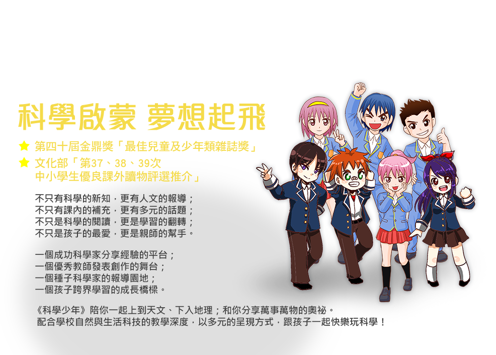 科學不獨屬於物理化學或某個知識類科,也不是資優生和宅男的專利,而是一種觀察世界,綜整經驗的思考習慣和方法,每一個對世界充滿好奇的孩子,心中都有著等待被啟蒙的科學種子。十二年國教的大免試時代,希望更多中學生有時間、有機會閱讀《科學少年》,以及愈來愈多充滿趣味和生活化的科學啟蒙讀物,幫助他們點燃學習的動機,對知識充滿熱情,成為有邏輯力、思考力、創造力的未來好公民。