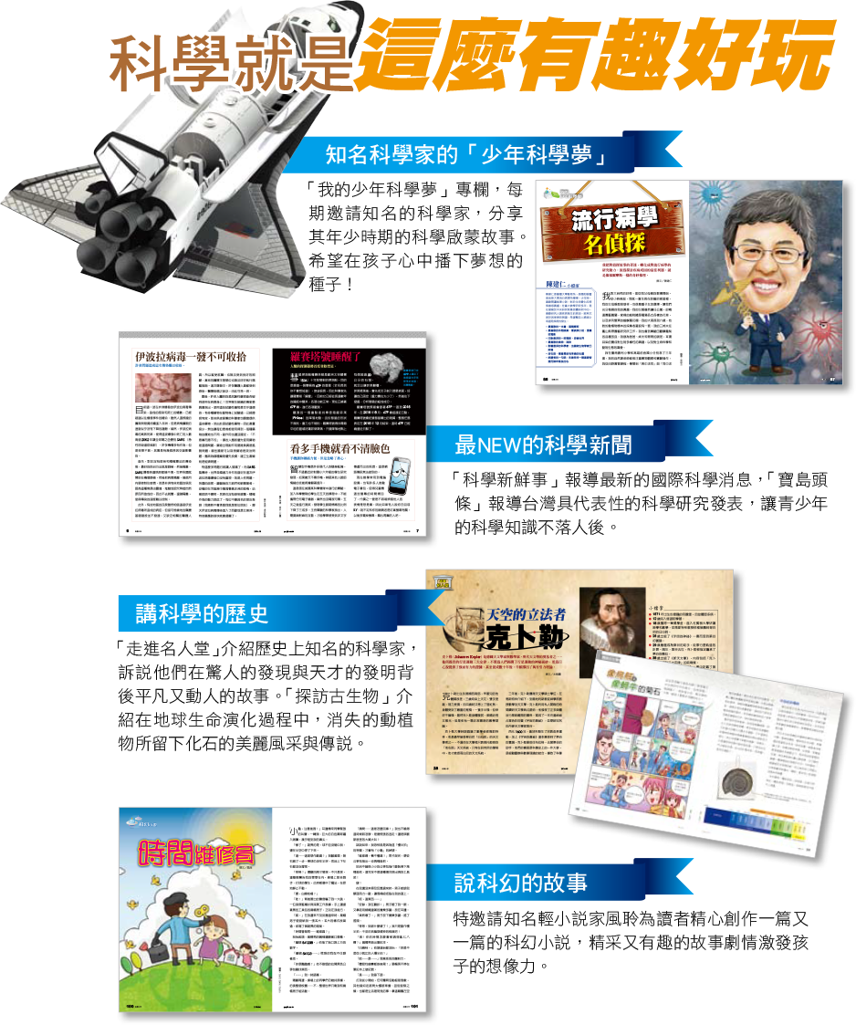 每期不但有最新話題科學新聞,還有最先端的科學新知包括醫療、科技、宇宙探索等。