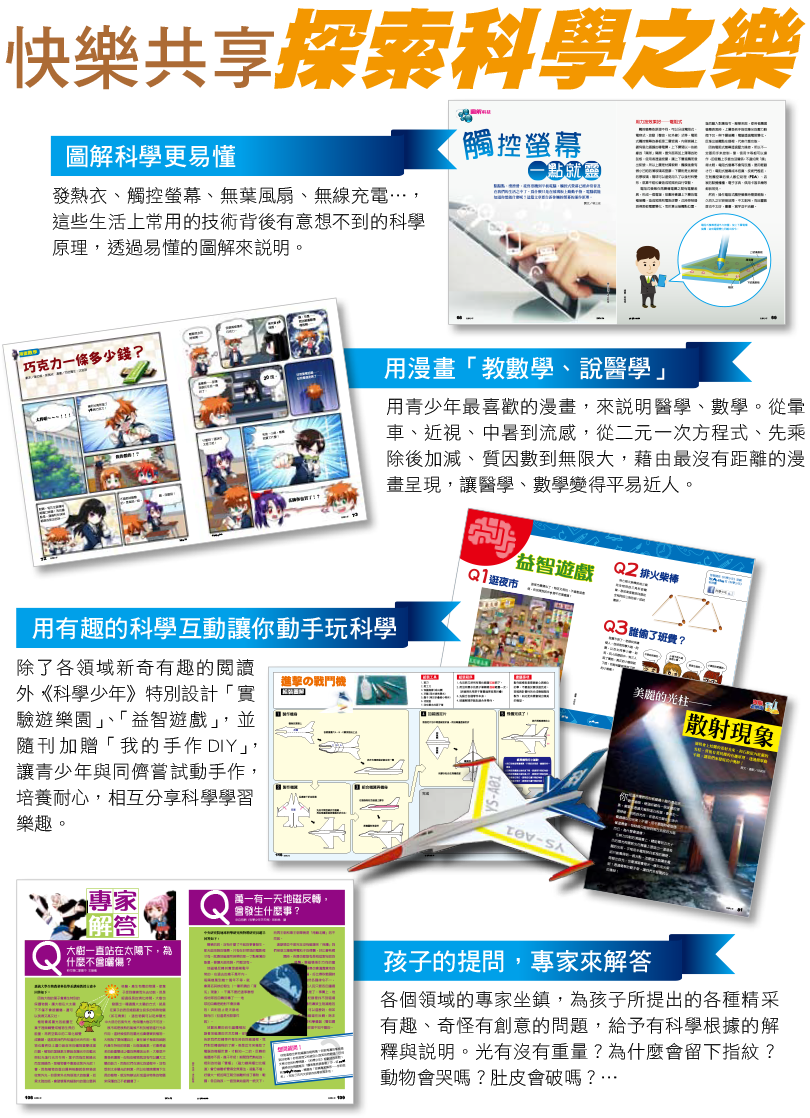 《科學少年》是一本非常適合國中小學生閱讀的科學雜誌,由淺入深且配合國中理化課程的各個專題,有趣的文字與豐富的插圖更能引起學生對科學的興趣,漸進的引發學生想要更加深入探討科學的動力,閱讀《科學少年》不僅增加了學生的課外科學知識,更能培育學生對於科學的興趣與學習科學的動力,讓科學變的好玩且生活化!學科學再也不是枯燥乏味的教科書,而是多采多姿的豐富世界!